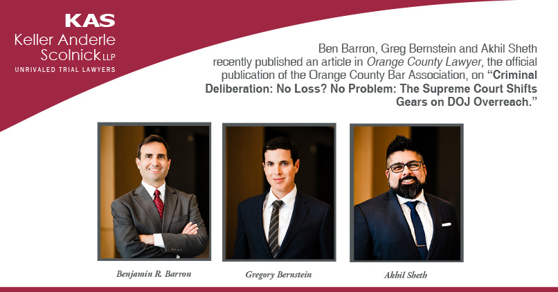 Ben Barron, Greg Bernstein and Akhil Sheth recently published an article in Orange County Lawyer, the official publication of the Orange County Bar Association, on “Criminal Deliberation: No Loss? No Problem: The Supreme Court Shifts Gears on DOJ Overreach.”